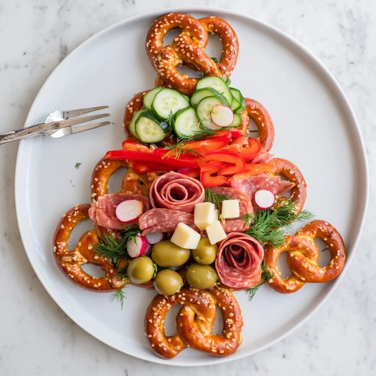 - Artfully arrange cheese, cured meats (if using), vegetables, olives, and radishes among and around the pretzels to create a lush, colorful tree effect. Garnish with fresh herbs.