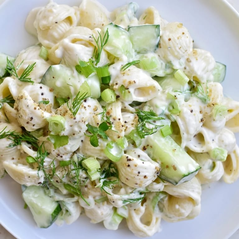 - Add the cooled pasta, diced cucumber, sliced green onions, and chopped dill into the bowl with the dressing. Use a big spoon or spatula to fold it all together gently so the shells don't break apart.