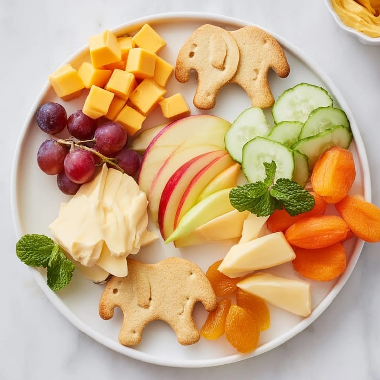 Save A whimsical and eye-catching snack board featuring elephant-shaped crackers, cheeses, fruits, and dips—perfect for parties or family gatherings.