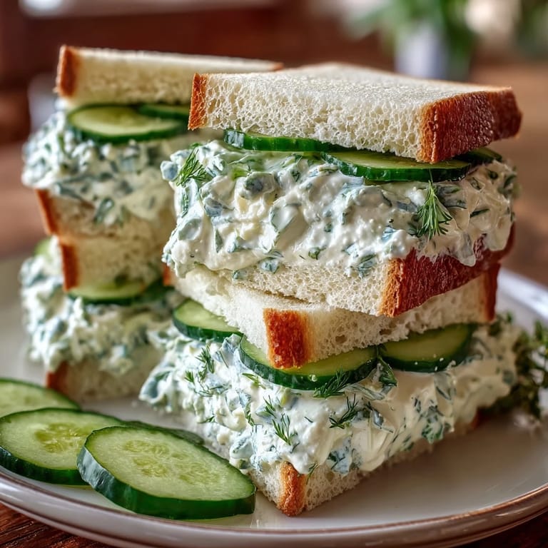 Present these elegant sandwiches on a tiered serving stand for traditional afternoon tea service, or arrange them on a decorative platter garnished with fresh dill sprigs and thin cucumber slices. They pair beautifully with other tea sandwiches, scones with clotted cream, and fresh berries. For a Derby party, serve alongside pimento cheese sandwiches and mini ham biscuits. Complement the refreshing cucumber flavor with iced mint tea, champagne, or classic mint juleps. Keep sandwiches covered with a lightly dampened paper towel until serving to prevent the bread from drying out. These delicate bites are best enjoyed within a few hours of assembly for optimal texture and freshness.
