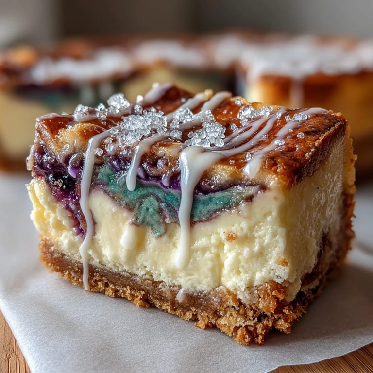 Save My kitchen exploded in purple, green, and gold the first time I attempted these bars, literally—a bottle of gel food coloring tipped sideways and stained my countertop for weeks. But something magical happened when I pulled that marbled cheesecake from the oven: it looked like edible Mardi Gras confetti, and suddenly the mess felt worth it. This recipe emerged from my obsession with combining two completely different desserts into one show-stopping bar that tastes as festive as it looks.