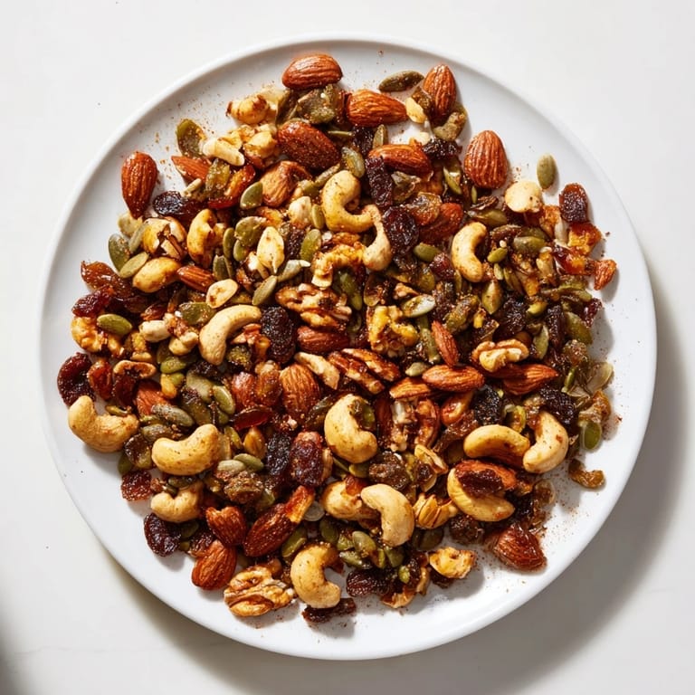 Save A crunchy, wholesome snack mix featuring roasted nuts, seeds, dried fruits, and a hint of spice—perfect for an energy boost or sharing at gatherings.