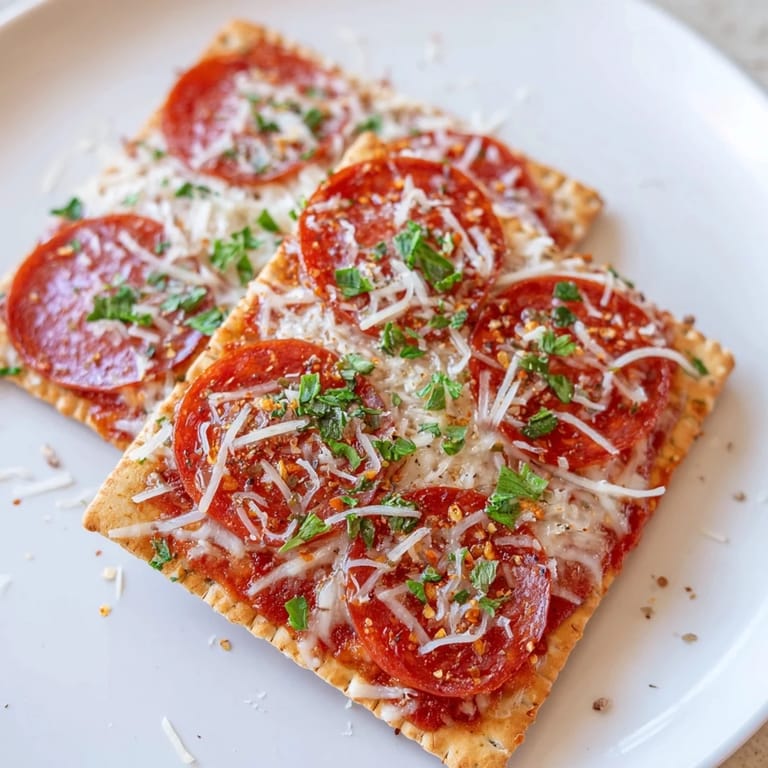 Save A quick and irresistible appetizer featuring zesty pepperoni slices layered on crisp square crackers, topped with melty cheese for the perfect snack or party bite.