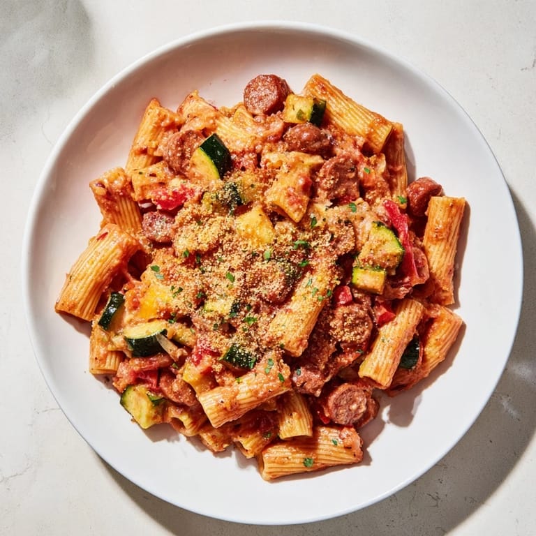 Save A hearty, flavor-packed pasta bake featuring spicy vegan chorizo, roasted vegetables, and a creamy tomato sauce, perfect for a comforting plant-based meal.